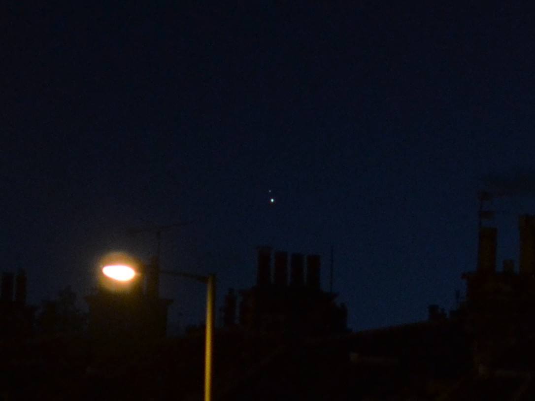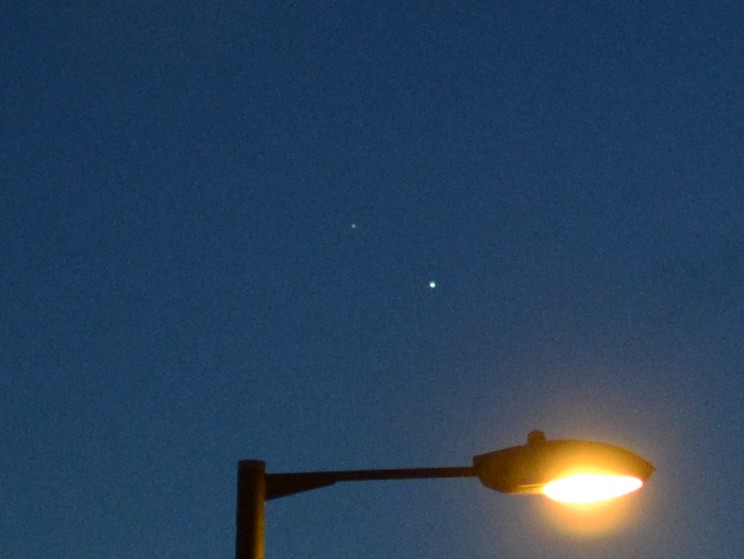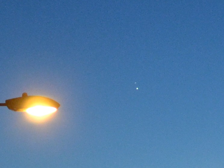 This is described in most places as the “Great Conjunction” because it doesn’t happen very often. The closest approach of Jupiter and Saturn in the sky (they’re a long way apart, but almost in the same direction) is today. It’s cloudy though, so here’s a photo from yesterday. They don’t get much closer.