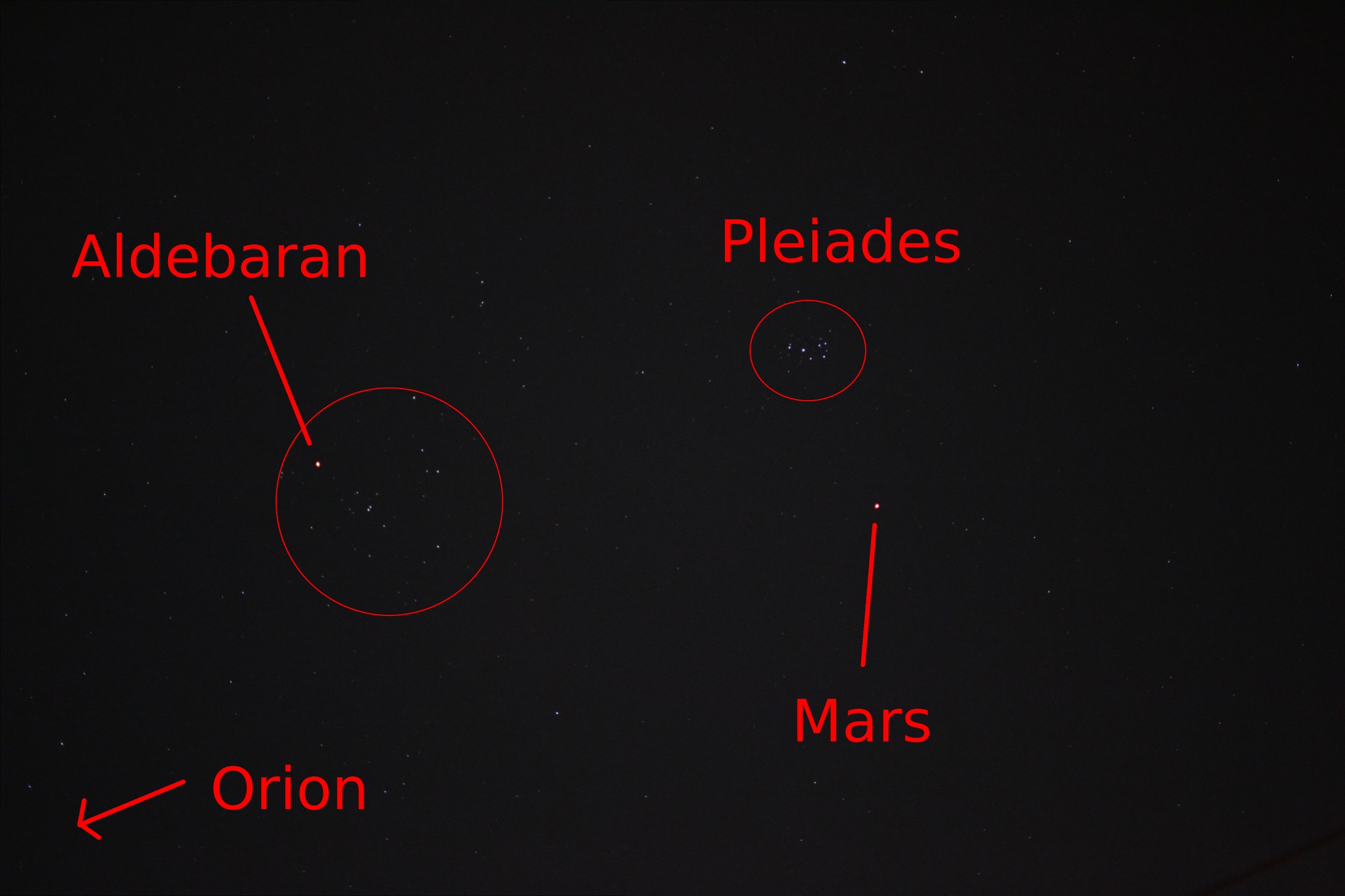 I was just using my normal “portrait” lens, a 35mm f/1.8 lens I obtained last year and have since been using almost all the time as I like it so much on my Nikon D3100 DX format camera. A 35mm lens is more or less the equivalent of a standard 50mm focal length lens on the old 35mm “full frame” format. Mars looks big simply because it’s bright; using this lens the actual image size of Mars would be similar to that of the stars.