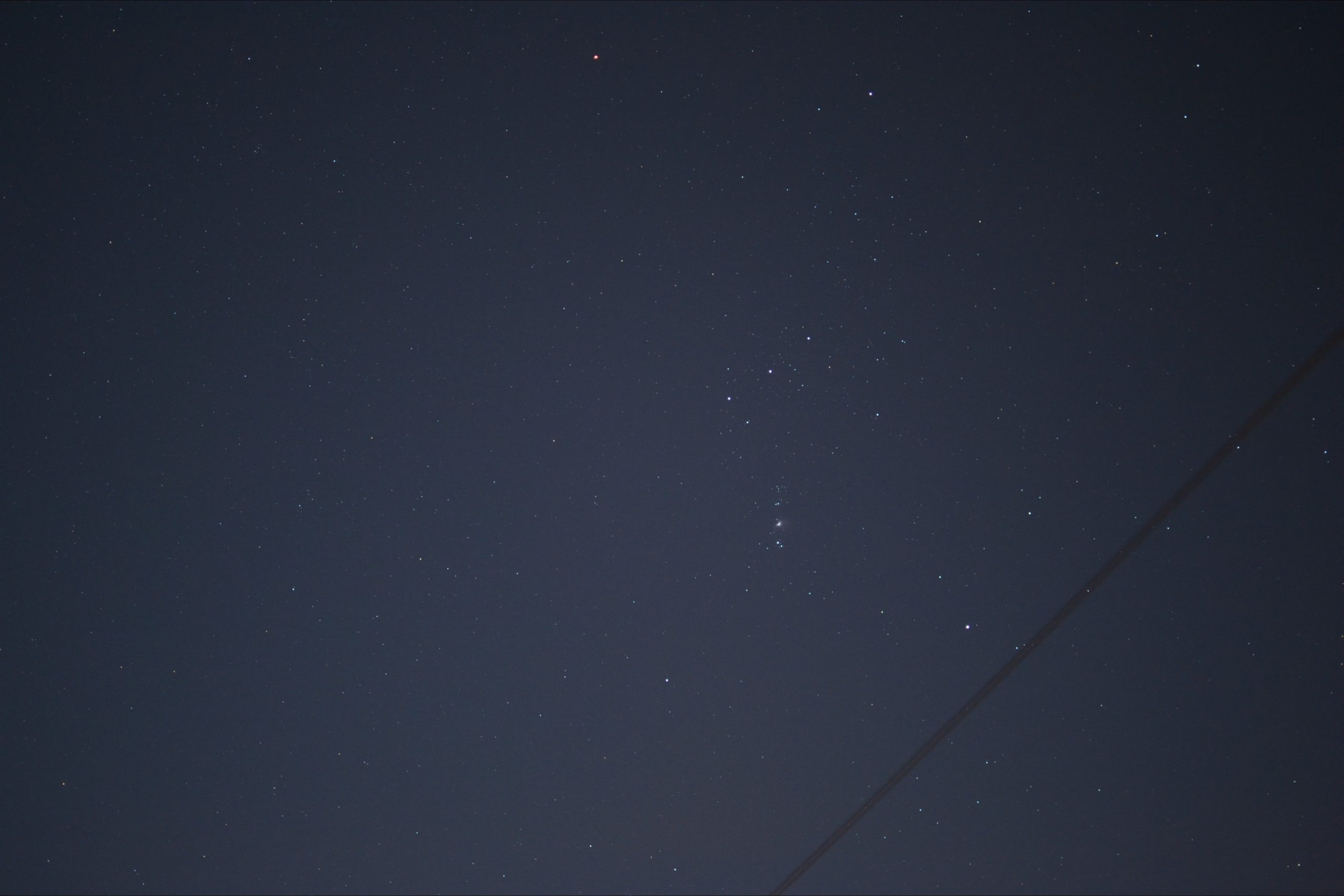 The mount is a Sky-Watcher Star Discovery “go-to” mount, which came with a WiFi dongle for control. However you don’t need to drive it for short exposures, and I have played around with a few wide field photos. Here’s Orion; I have posted the full size photo (though a jpeg to keep it small) which can be selected to get the full resolution. It’s this image that the header photo was taken from. It’s not ideal in that it was a full Moon, it’s taken from the city (neighbour’s telephone line through the field of view), but it was for practice. I think I now have satisfactory camera settings and I am playing with software; this image is a stack of five 1 second exposures (f/1.8 35mm lens on the Nikon D3100) aligned and stacked using the RegiStax software package.