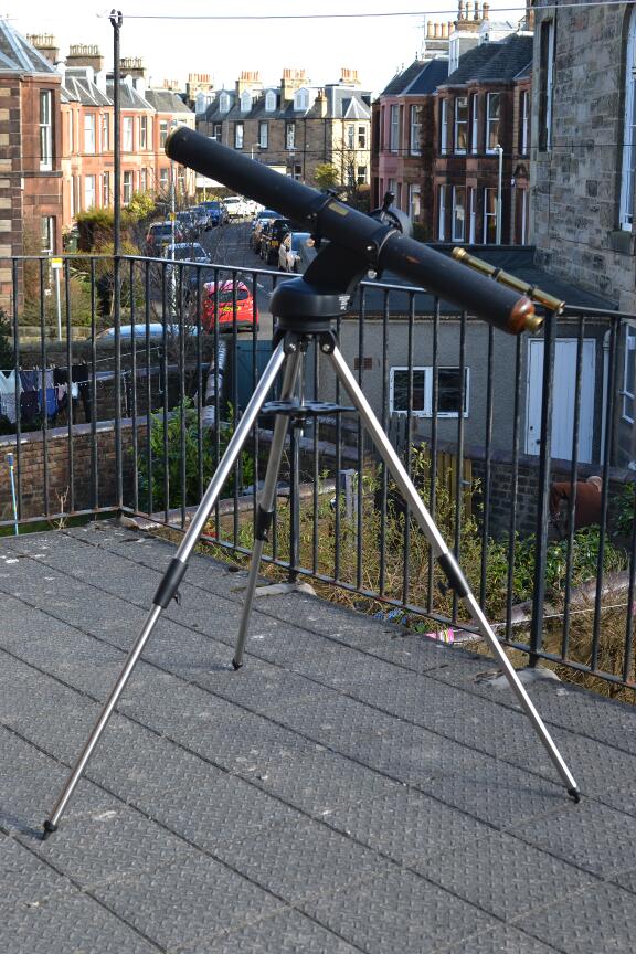 The mount can take a 5kg load, so I realised it could also be used with my old “three inch” (75mm aperture) telescope. Here it is – it’s a bit low so I will be adapting the tripod to fit on a much taller old wooden tripod.