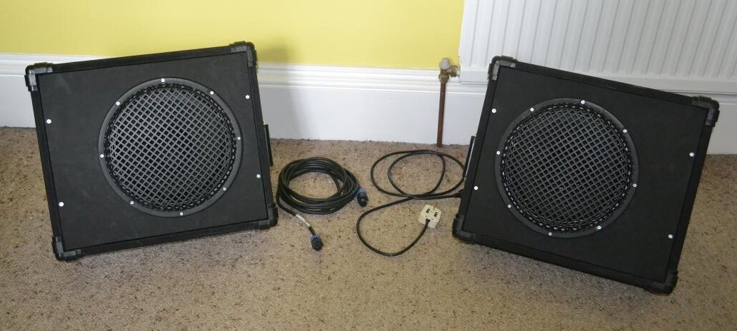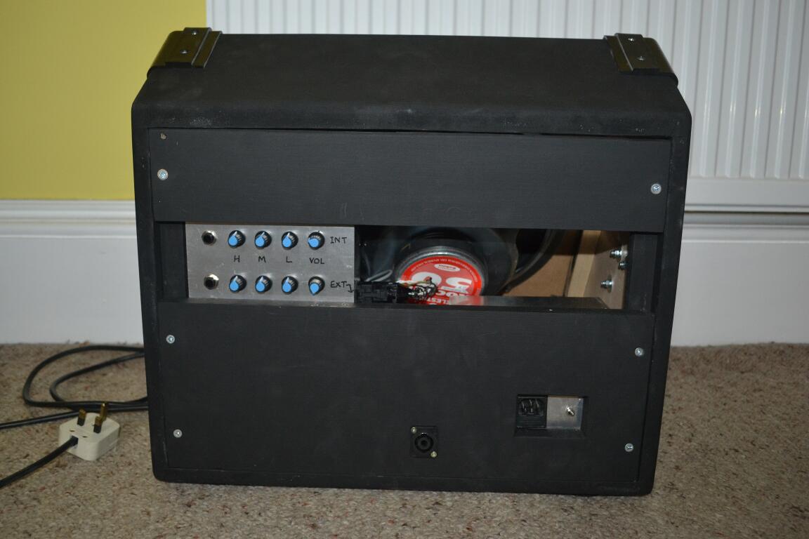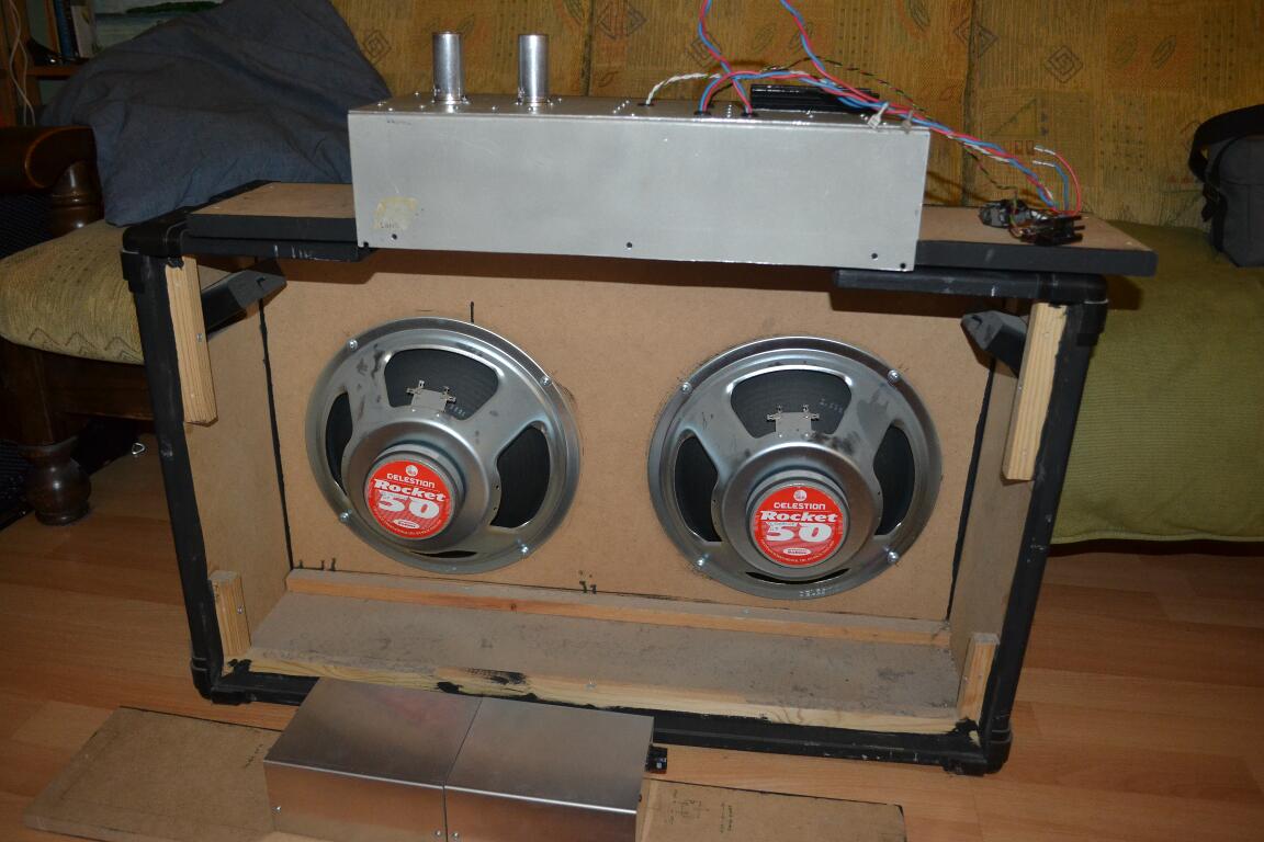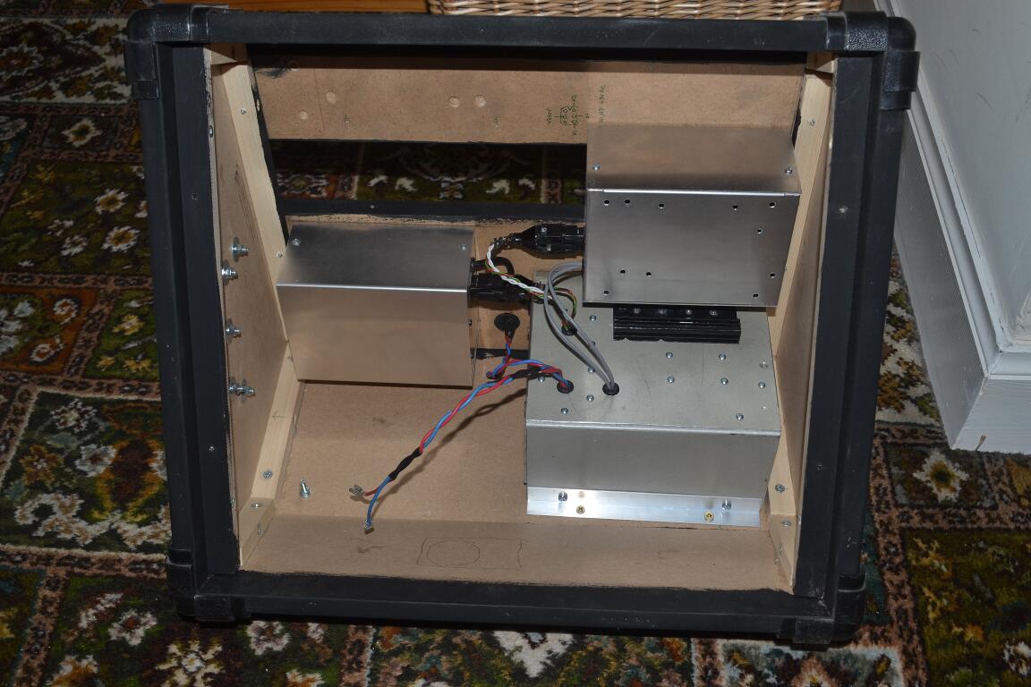 With the back off and the amp moved onto the top of the cabinet you can see the speakers fully, and the power supply boxes on one of the back panels below: