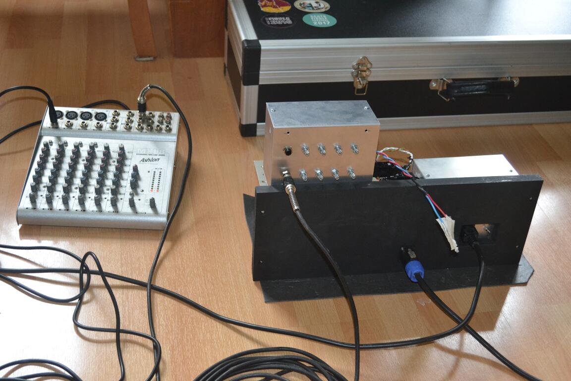 Once assembled, the electronics worked as expected, using the mixer I also found on eBay as a source (which is what I will use with microphones on stage). Here’s the lash-up: