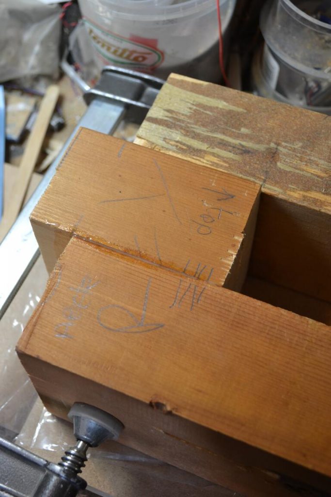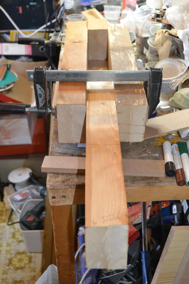 The next bit was to join the neck piece – note the use of a protective piece of chipboard to stop the clamps messing up the joint surface on the other side.