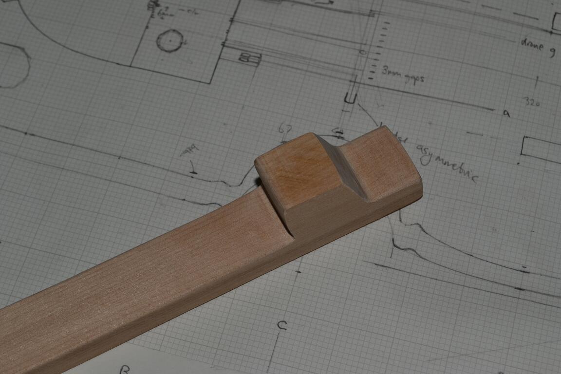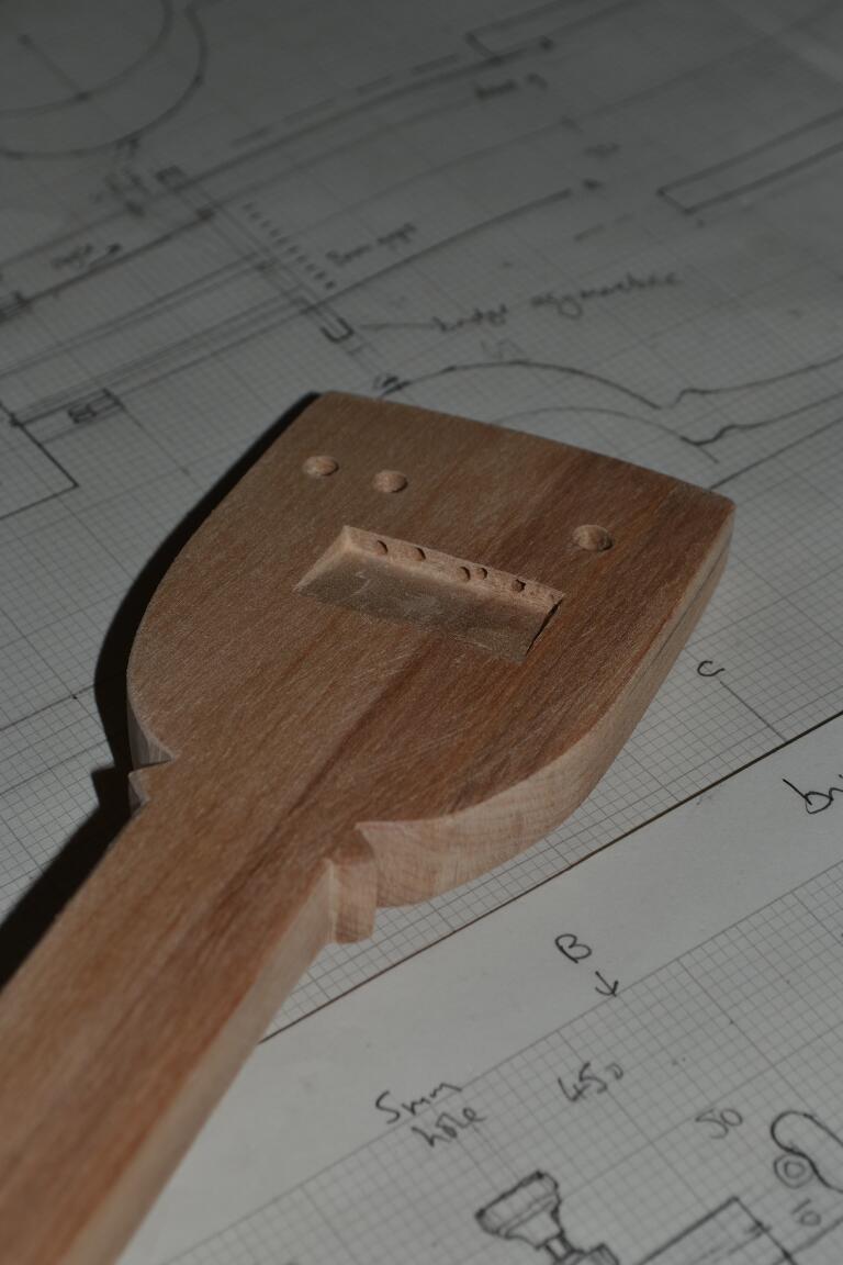 The tailpiece isn’t fastened to the body, just held in place by the tension of the strings and a retaining string or wire. It must be strong enough not to break under tension. I still haven’t decided whether or not to add a reinforcing screw – it’s probably not needed.