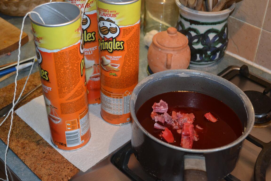 The Pringles cartons make great moulds; I drill a hole in the metal end to take the wick, knotted to hold it in place. It’s held at the top by being tied to a pencil.