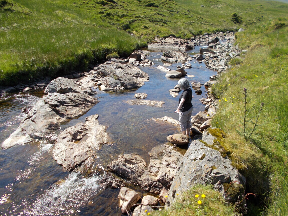 The track eventually nears the burn (Allt an Dubh Choirein) in the valley bottom which had a reasonable amount of water in it even after the recent dry period. Very cooling for hot feet!