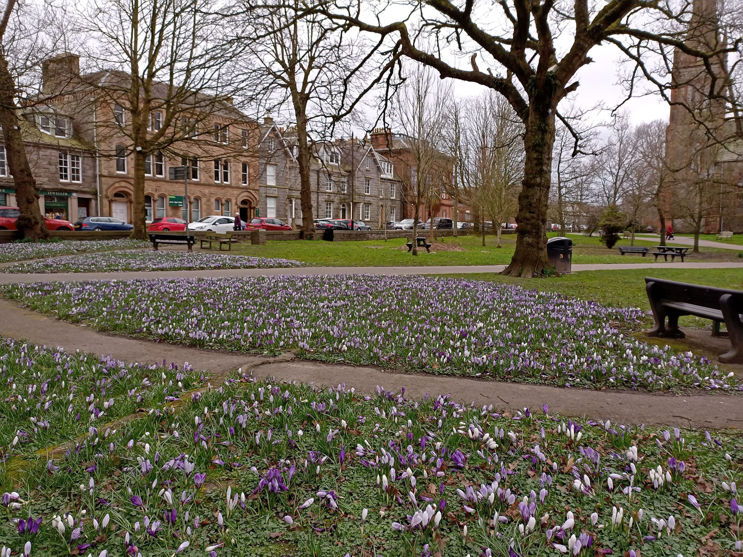 Crocuses in the park in Kirkcudbright. A spring-like start to our caravan season.