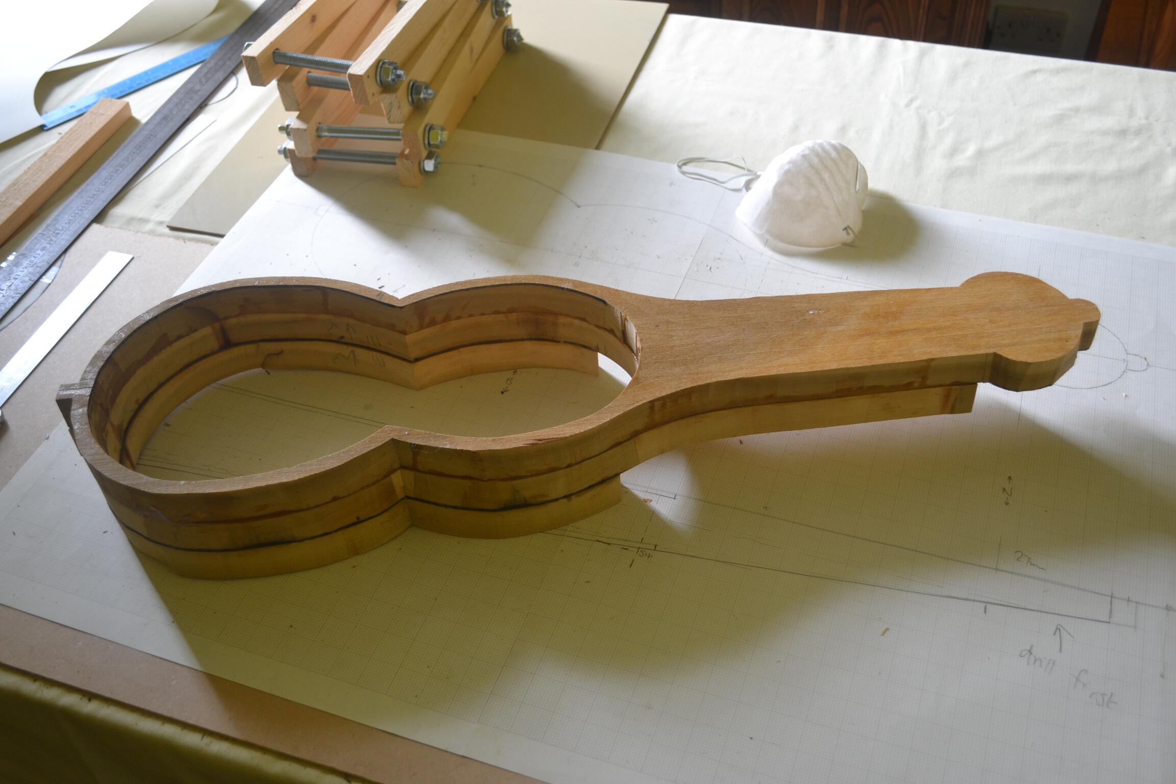 Three layers of the wood I had available is enough for the body thickness. It’s a strange shaped instrument, so there’s a lot of shaping to be done after the glueing.