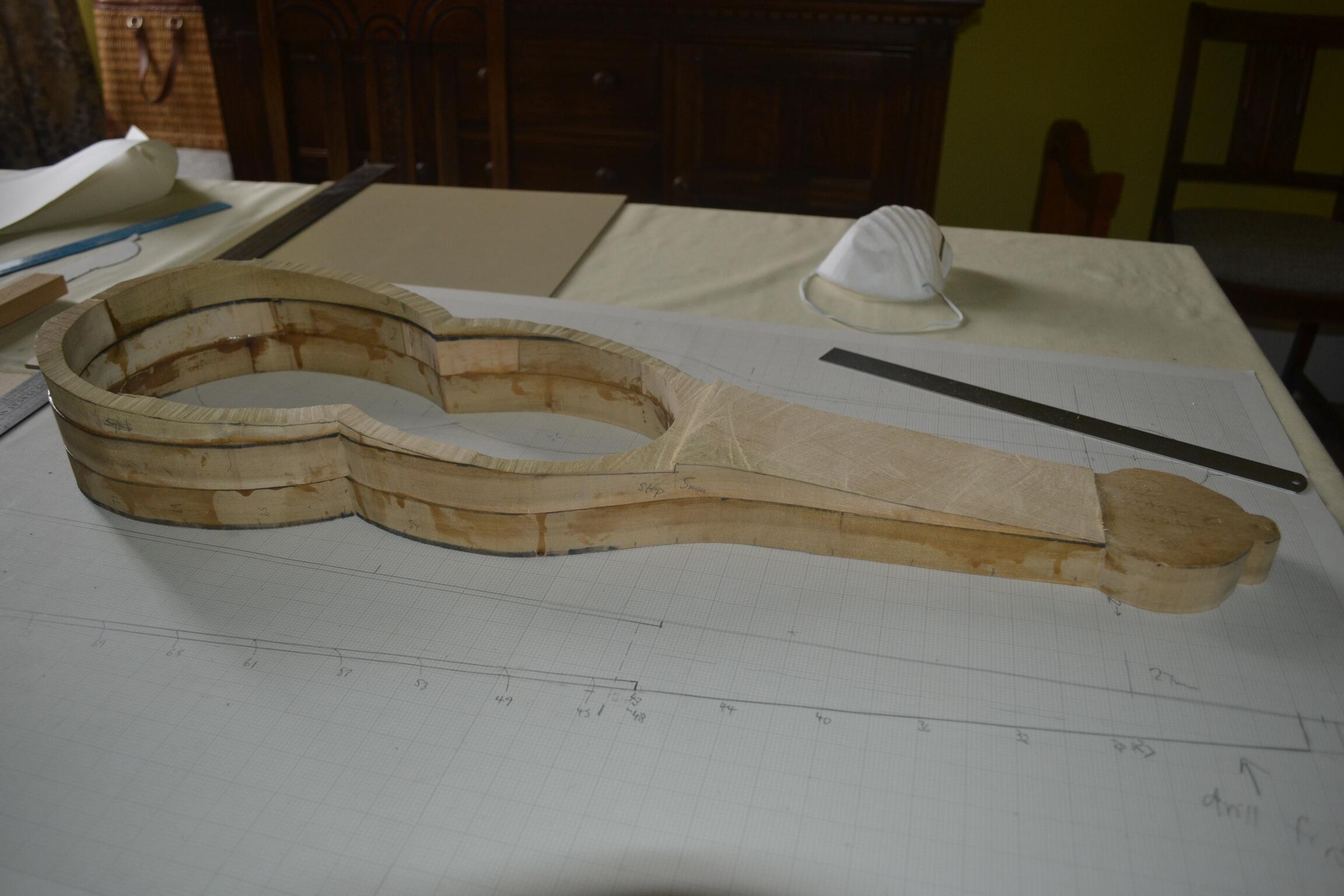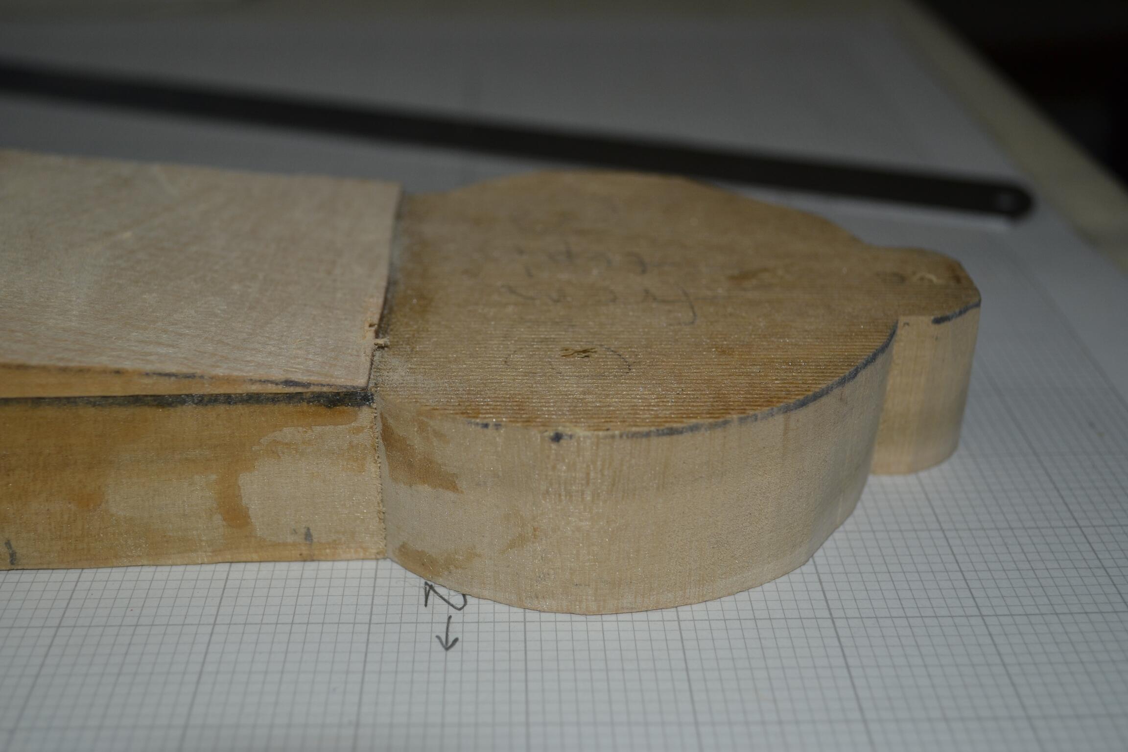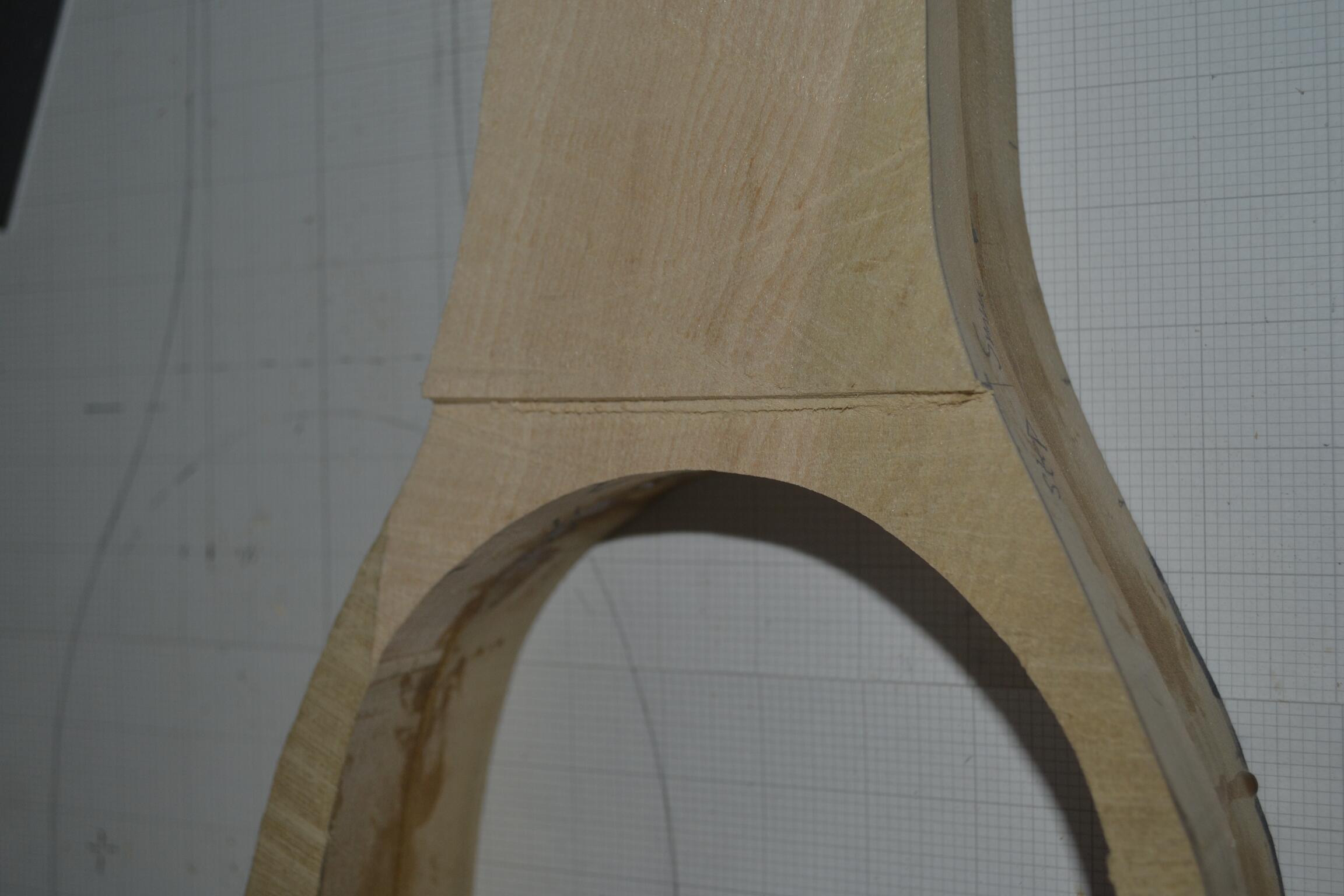 Here’s the step in the cut on the back of the body, to accommodate the back which will be planed down from a piece of the piano soundboard.